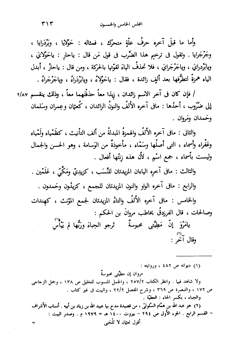 والخامس: ما فى آخره الألف والتاء المزيدتان لجمع المؤنث، كهندات وصالحات، قال الفرزدق يخاطب مروان بن الحكم: