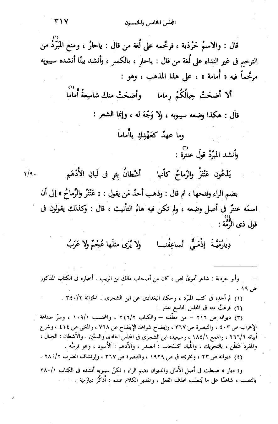 (¬4) ديوانه ص 23، وتخريجه فى ص 1929، والتبصرة ص 367، وارتشاف الضرب 2/ 280. و «ديار» ضبطت فى أصل الأمالى والديوان بضم الراء، لكنّ سيبويه أنشده فى الكتاب 1/ 280 بالنصب، شاهدا على ما ينصب بحذف الفعل، وتقدير الكلام عنده: أذكر ديار مية.