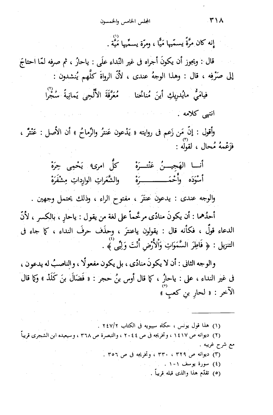 والوجه الثانى: أن لا يكون منادى، بل يكون مفعولا، والناصب له يدعون، فى غير النداء، على: يا حار، كما قال أوس بن حجر: «فضال بن كلد» وكما قال الآخر: «لحار بن كعب (¬5)»