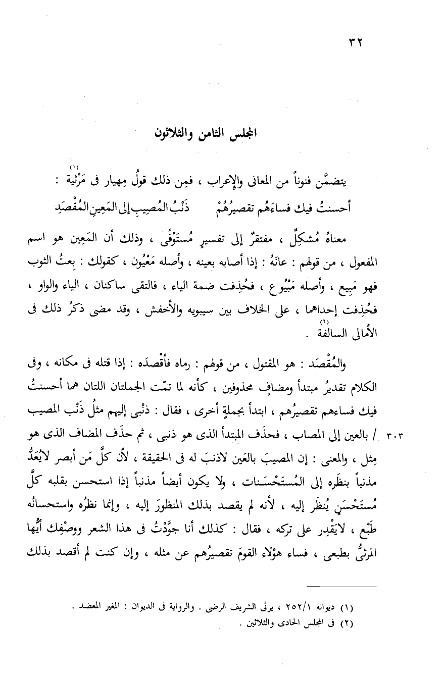 والمقصد: هو المقتول، من قولهم: رماه فأقصده: إذا قتله فى مكانه، وفى الكلام تقدير مبتدأ ومضاف محذوفين، كأنه لما تمّت الجملتان اللتان هما أحسنت فيك فساءهم تقصيرهم، ابتدأ بجملة أخرى، فقال: ذنبى إليهم مثل ذنب المصيب /بالعين إلى المصاب، فحذف المبتدأ الذى هو ذنبى، ثم حذف المضاف الذى هو مثل، والمعنى: إن المصيب بالعين لا ذنب له فى الحقيقة، لأن كلّ من أبصر لا يعدّ مذنبا بنظره إلى المستحسنات، ولا يكون أيضا مذنبا إذا استحسن بقلبه كلّ مستحسن ينظر إليه، لأنه لم يقصد بذلك المنظور إليه، وإنما نظره واستحسانه طبع، لا يقدر على تركه، فقال: كذلك أنا جوّدت فى هذا الشعر ووصفك أيّها المرثىّ بطبعى، فساء هؤلاء القوم تقصيرهم عن مثله، وإن كنت لم أقصد بذلك