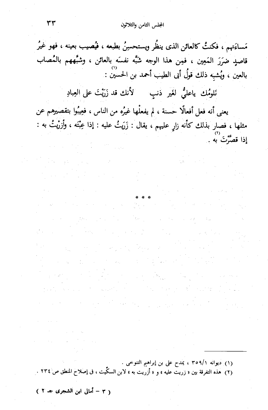 مساءتهم، فكنت كالعاين الذى ينظر ويستحسن بطبعه، فيصيب بعينه، فهو غير قاصد ضرر المعين، فمن هذا الوجه شبّه نفسه بالعائن، وشبّههم بالمصاب بالعين، ويشبه ذلك قول أبى الطيب أحمد بن الحسين (¬1):
