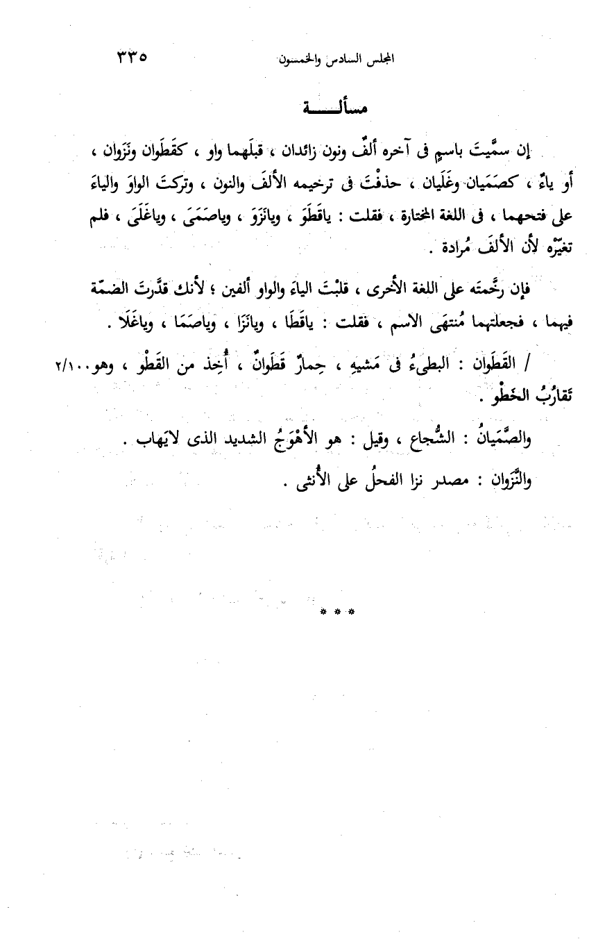 إن سمّيت باسم فى آخره ألف ونون زائدان، قبلهما واو، كقطوان ونزوان، أو ياء، كصميان وغليان، حذفت فى ترخيمه الألف والنون، وتركت الواو والياء على فتحهما، فى اللغة المختارة، فقلت: يا قطو، ويا نزو، ويا صمى، ويا غلى، فلم تغيّره لأن الألف مرادة.