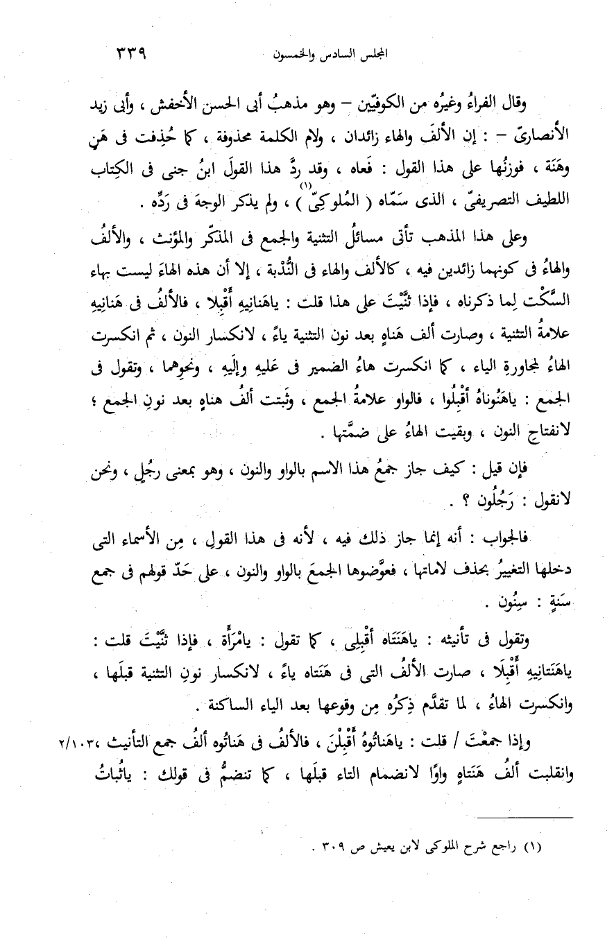 وعلى هذا المذهب تأتى مسائل التثنية والجمع فى المذكّر والمؤنث، والألف والهاء فى كونهما زائدين فيه، كالألف والهاء فى النّدبة، إلا أن هذه الهاء ليست بهاء السّكت لما ذكرناه، فإذا ثنّيت على هذا قلت: يا هنانيه أقبلا، فالألف فى هنانيه علامة التثنية، وصارت ألف هناه بعد نون التثنية ياء، لانكسار النون، ثم انكسرت الهاء لمجاورة الياء، كما انكسرت هاء الضمير فى عليه وإليه، ونحوهما، وتقول فى الجمع: يا هنوناه أقبلوا، فالواو علامة الجمع، وثبتت ألف هناه بعد نون الجمع؛ لانفتاح النون، وبقيت الهاء على ضمّتها.