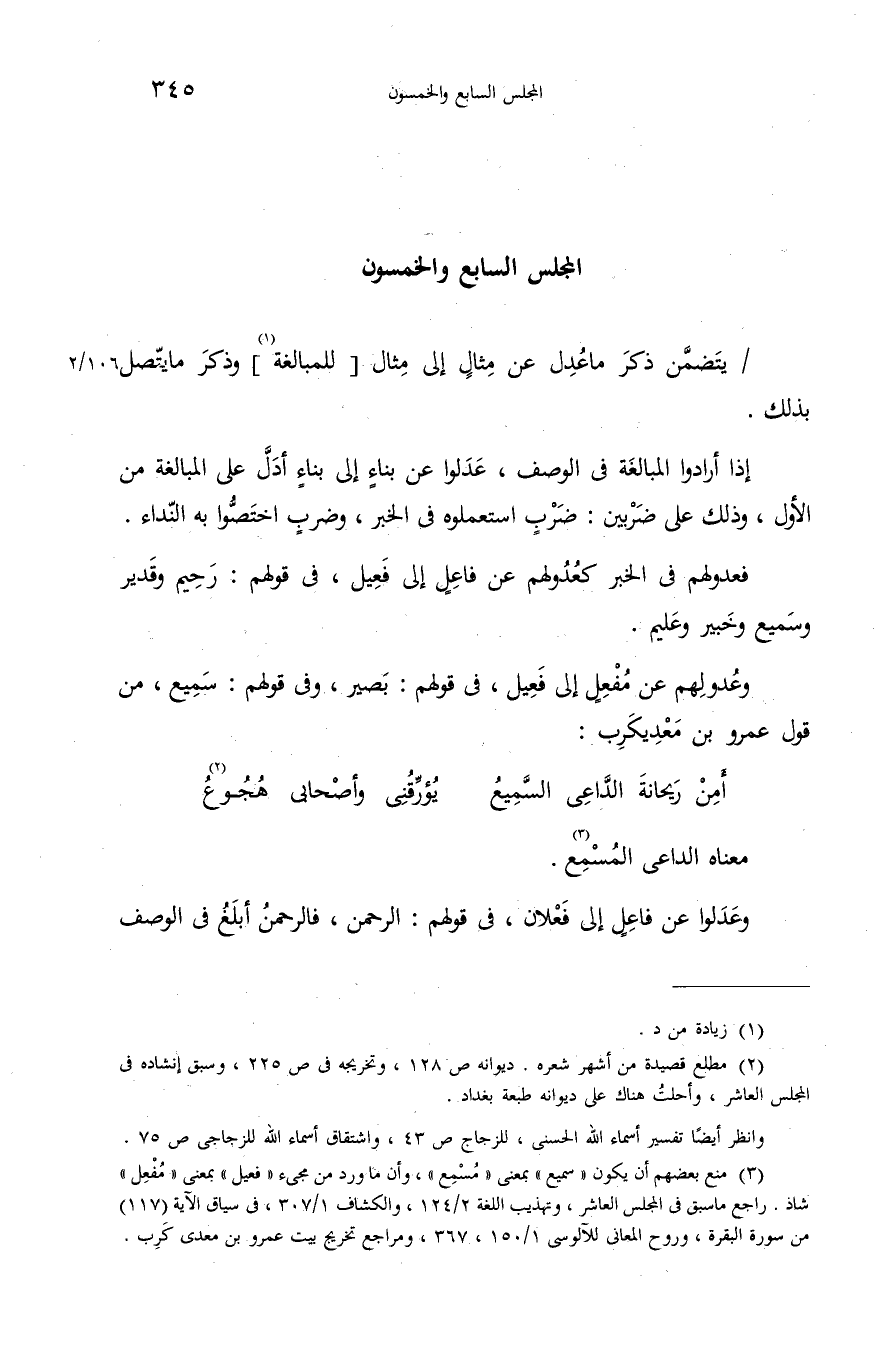 (¬3) منع بعضهم أن يكون «سميع» بمعنى «مسمع»، وأن ما ورد من مجىء «فعيل» بمعنى «مفعل» شاذ. راجع ما سبق فى المجلس العاشر، وتهذيب اللغة 2/ 124، والكشاف 1/ 307، فى سياق الآية (117) من سورة البقرة، وروح المعانى للآلوسى 1/ 150،367، ومراجع تخريج بيت عمرو بن معدى كرب.