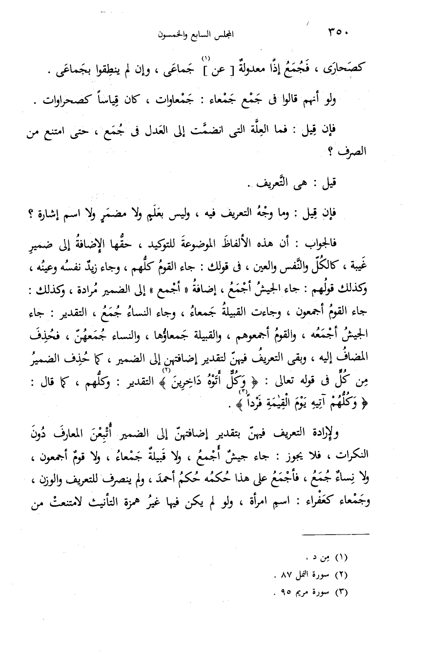 جاء القوم أجمعون، وجاءت القبيلة جمعاء، وجاء النساء جمع، التقدير: جاء الجيش أجمعه، والقوم أجمعوهم، والقبيلة جمعاؤها، والنساء جمعهنّ، فحذف المضاف إليه، وبقى التعريف فيهنّ لتقدير إضافتهن إلى الضمير، كما حذف الضمير من كلّ فى قوله تعالى: {وَكُلٌّ أَتَوْهُ داخِرِينَ} (¬2) التقدير: وكلّهم، كما قال: