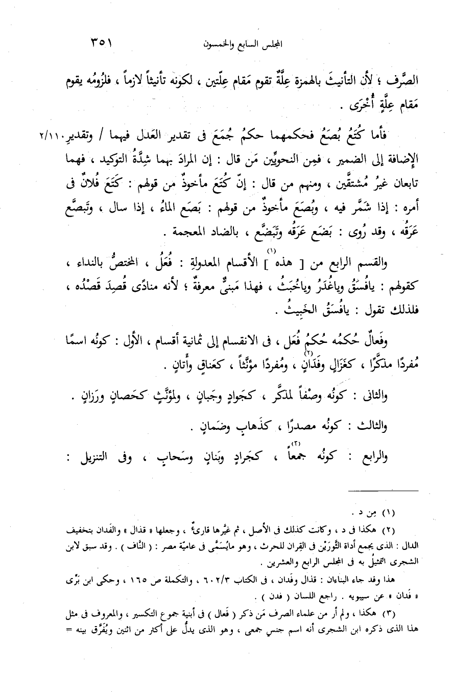 (¬3) هكذا، ولم أر من علماء الصرف من ذكر (فعال) فى أبنية جموع التكسير، والمعروف فى مثل هذا الذى ذكره ابن الشجرى أنه اسم جنس جمعى، وهو الذى يدلّ على أكثر من اثنين ويفرّق بينه-
