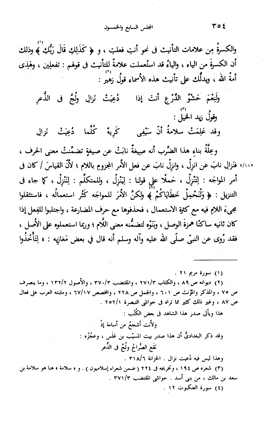 والكسرة من علامات التأنيث فى نحو أنت فعلت، و {كَذلِكَ قالَ رَبُّكَ} (¬1) وذلك أن الكسرة من الياء، والياء قد استعملت علامة للتأنيث فى قولهم: تفعلين، وهذى أمة الله، ويدلّك على تأنيث هذه الأسماء قول زهير (¬2):