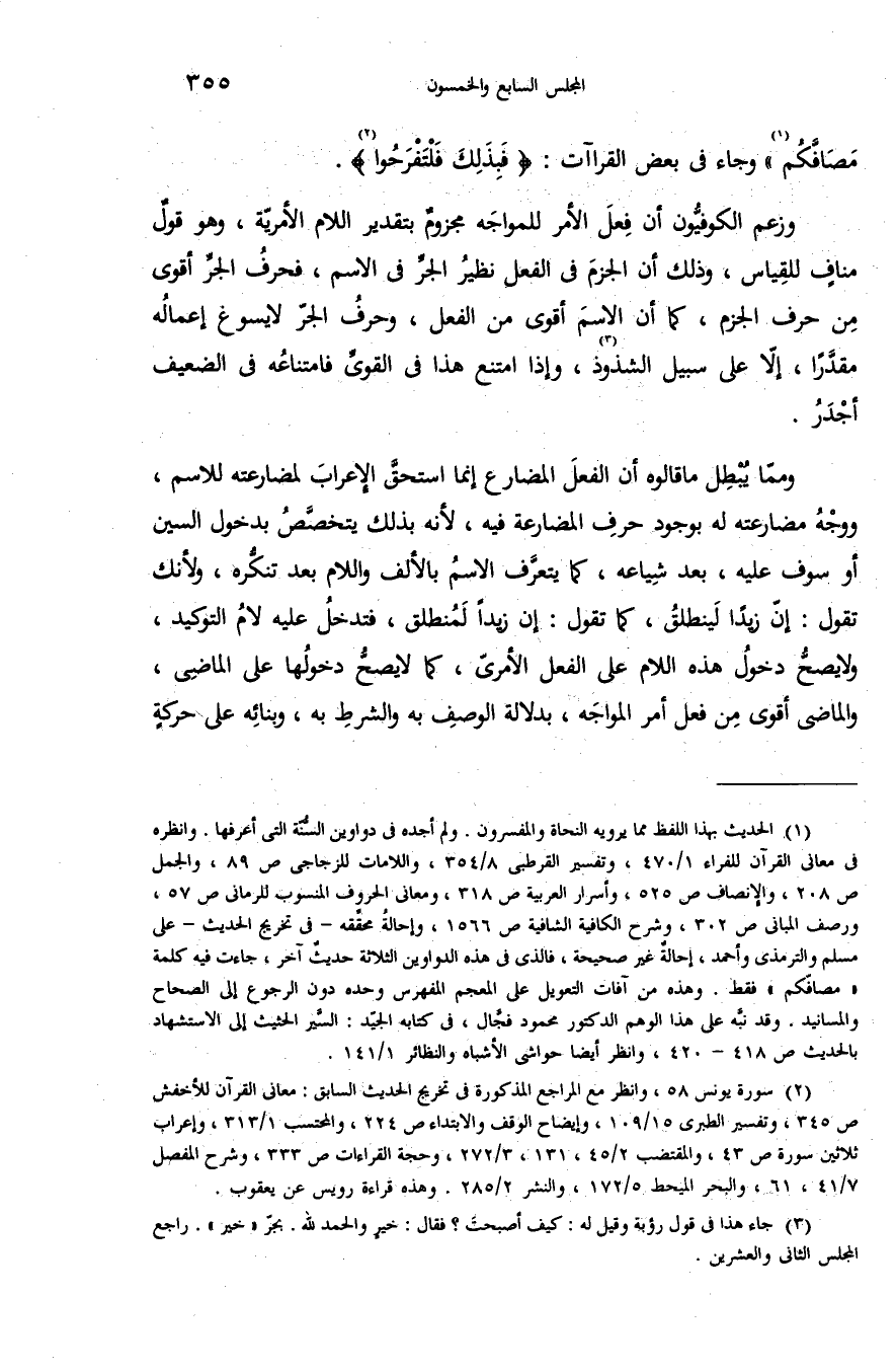 (¬1) الحديث بهذا اللفظ مما يرويه النحاة والمفسرون. ولم أجده فى دواوين السّنّة التى أعرفها. وانظره فى معانى القرآن للفراء 1/ 470، وتفسير القرطبى 8/ 354، واللامات للزجاجى ص 89، والجمل ص 208، والإنصاف ص 525، وأسرار العربية ص 318، ومعانى الحروف المنسوب للرمانى ص 57، ورصف المبانى ص 302، وشرح الكافية الشافية ص 1566، وإحالة محقّقه-فى تخريج الحديث-على مسلم والترمذى وأحمد، إحالة غير صحيحة، فالذى فى هذه الدواوين الثلاثة حديث آخر، جاءت فيه كلمة «مصافّكم» فقط. وهذه من آفات التعويل على المعجم المفهرس وحده دون الرجوع إلى الصحاح والمسانيد. وقد نبّه على هذا الوهم الدكتور محمود فجّال، فى كتابه الجيّد: السّير الحثيث إلى الاستشهاد بالحديث ص 418 - 420، وانظر أيضا حواشى الأشباه والنظائر 1/ 141.