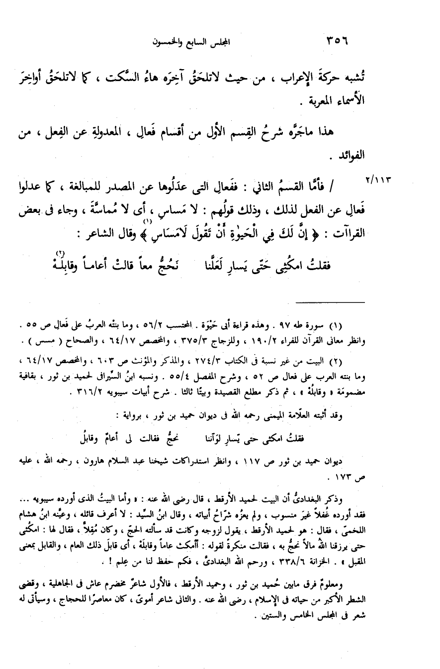 (¬2) البيت من غير نسبة فى الكتاب 3/ 274، والمذكر والمؤنث ص 603، والمخصص 17/ 64، وما بنته العرب على فعال ص 52، وشرح المفصل 4/ 55. ونسبه ابن السّيرافى لحميد بن ثور، بقافية مضمومة «وقابله»، ثم ذكر مطلع القصيدة وبيتا ثالثا. شرح أبيات سيبويه 2/ 316. وقد أثبته العلاّمة الميمنى رحمه الله فى ديوان حميد بن ثور، برواية: فقلت امكثى حتى يسار لو أننا نحجّ فقالت لى أعام وقابل ديوان حميد بن ثور ص 117، وانظر استدراكات شيخنا عبد السلام هارون، رحمه الله، عليه ص 173. وذكر البغدادىّ أن البيت لحميد الأرقط، قال رضى الله عنه: «وأما البيت الذى أورده سيبويه. . . فقد أورده غفلا غير منسوب، ولم يعزه شرّاح أبياته، وقال ابن السيّد: لا أعرف قائله، وعيّنه ابن هشام اللخمىّ، فقال: هو لحميد الأرقط، يقول لزوجه وكانت قد سألته الحجّ، وكان مقلاّ، فقال لها: امكثى حتى يرزقنا الله مالا نحجّ به، فقالت منكرة لقوله: أأمكث عاما وقابله، أى قابل ذلك العام، والقابل بمعنى المقبل». الخزانة 6/ 338، ورحم الله البغدادىّ، فكم حفظ لنا من علم!. ومعلوم فرق ما بين حميد بن ثور، وحميد الأرقط، فالأول شاعر مخضرم عاش فى الجاهلية، وقضى الشطر الأكبر من حياته فى الإسلام، رضى الله عنه. والثانى شاعر أموىّ، كان معاصرا للحجاج، وسيأتى له شعر فى المجلس الخامس والستين.