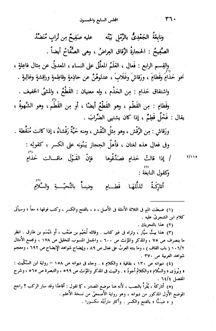(¬4) ديوانه ص 130، بقافية «والكلام». وجاء فى ديوانه ص 158 - رواية ابن السّكّيت: «ويروى «والسّلام «والكلام أجود». والبيت فى المذكر والمؤنث ص 599، والتبصرة ص 565، وشرح المفصل 4/ 64.
