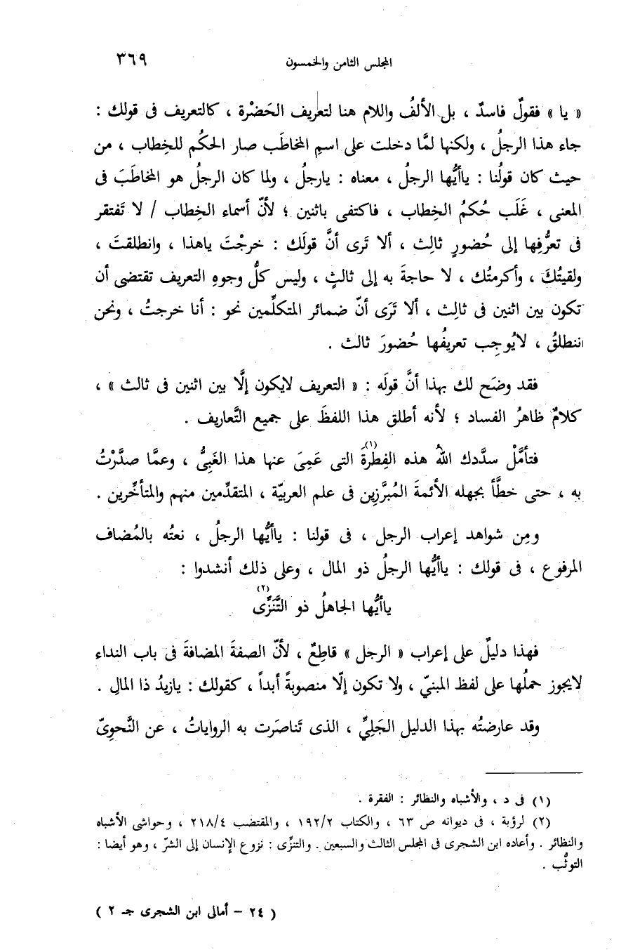 جاء هذا الرجل، ولكنها لمّا دخلت على اسم المخاطب صار الحكم للخطاب، من حيث كان قولنا: يا أيّها الرجل، معناه: يا رجل، ولما كان الرجل هو المخاطب فى المعنى، غلب حكم الخطاب، فاكتفى باثنين؛ لأنّ أسماء الخطاب/لا تفتقر فى تعرّفها إلى حضور ثالث، ألا ترى أنّ قولك: خرجت يا هذا، وانطلقت، ولقيتك، وأكرمتك، لا حاجة به إلى ثالث، وليس كلّ وجوه التعريف تقتضى أن تكون بين اثنين فى ثالث، ألا ترى أنّ ضمائر المتكلّمين نحو: أنا خرجت، ونحن ننطلق، لا يوجب تعريفها حضور ثالث.
