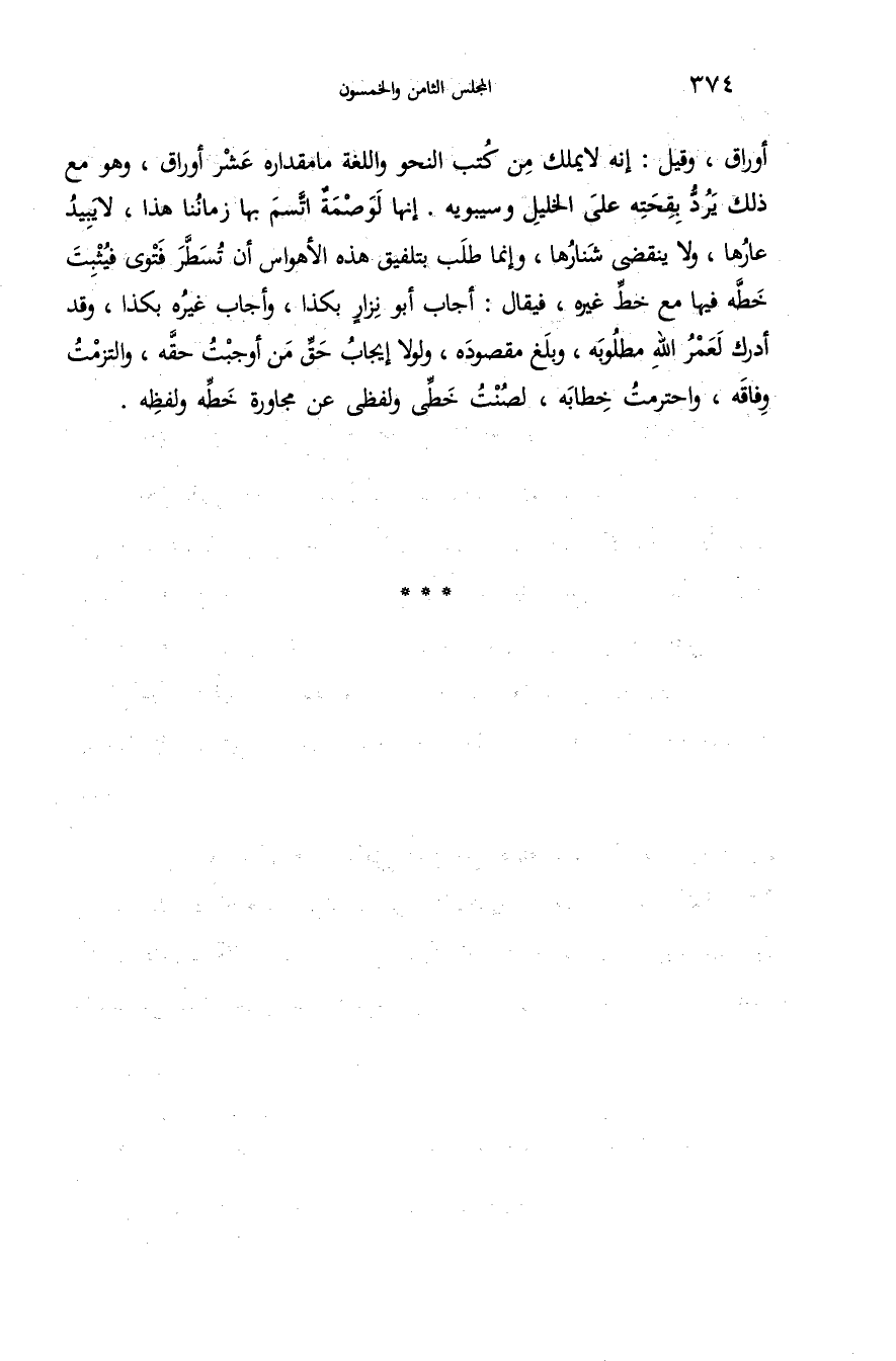 أوراق، وقيل: إنه لا يملك من كتب النحو واللغة ما مقداره عشر أوراق، وهو مع ذلك يردّ بقحته على الخليل وسيبويه. إنها لوصمة اتّسم بها زماننا هذا، لا يبيد عارها، ولا ينقضى شنارها، وإنما طلب بتلفيق هذه الأهواس أن تسطّر فتوى فيثبت خطّه فيها مع خطّ غيره، فيقال: أجاب أبو نزار بكذا، وأجاب غيره بكذا، وقد أدرك لعمر الله مطلوبه، وبلغ مقصوده، ولولا إيجاب حقّ من أوجبت حقّه، والتزمت وفاقه، واحترمت خطابه، لصنت خطّى ولفظى عن مجاورة خطّه ولفظه.