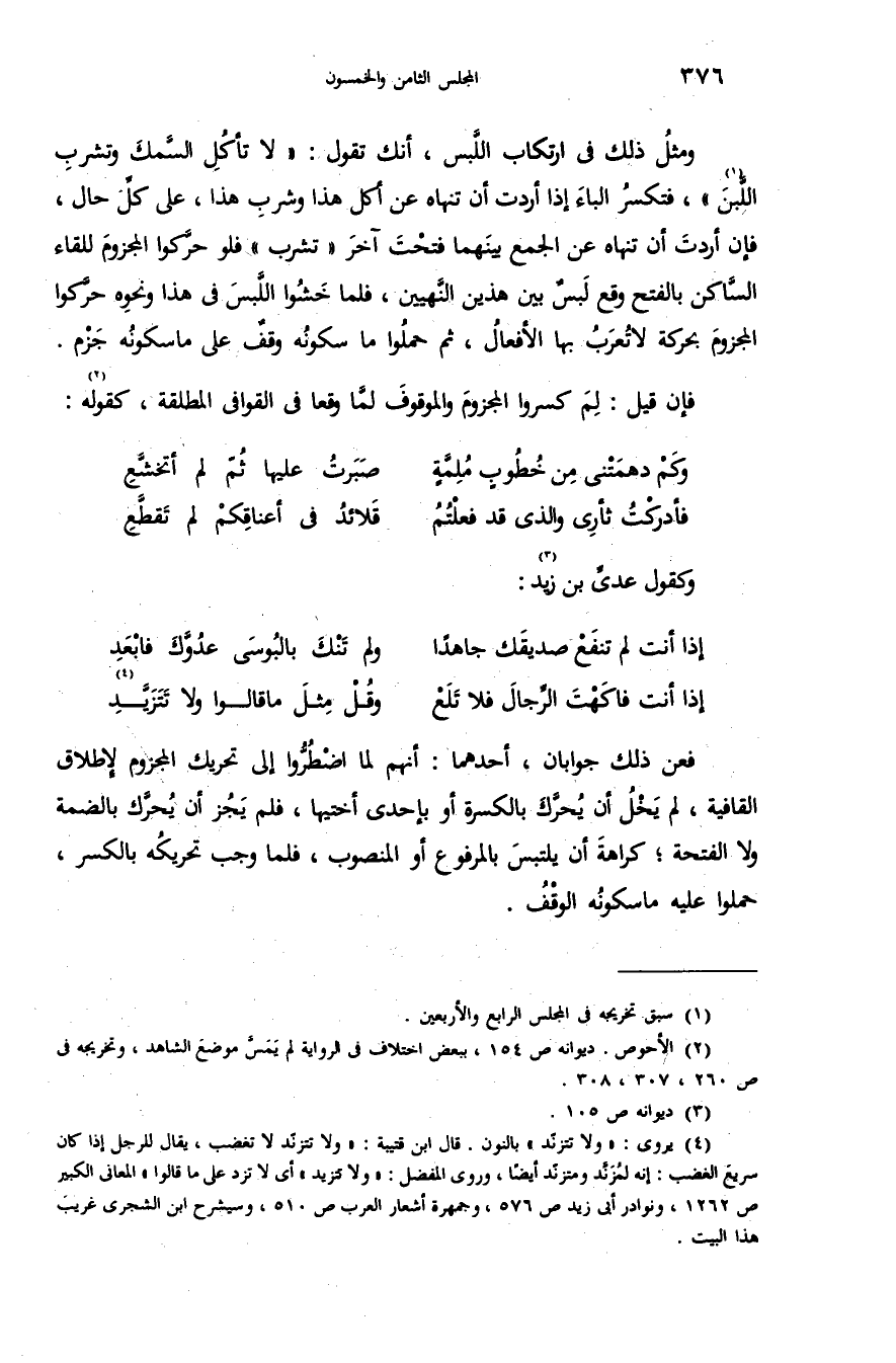 (¬4) يروى: «ولا تتزنّد» بالنون. قال ابن قتيبة: «ولا تتزنّد لا تغضب، يقال للرجل إذا كان سريع الغضب: إنه لمزنّد ومتزنّد أيضا، وروى المفضل: «ولا تتزيد» أى لا تزد على ما قالوا» المعانى الكبير ص 1262، ونوادر أبى زيد ص 576، وجمهرة أشعار العرب ص 510، وسيشرح ابن الشجرى غريب هذا البيت.