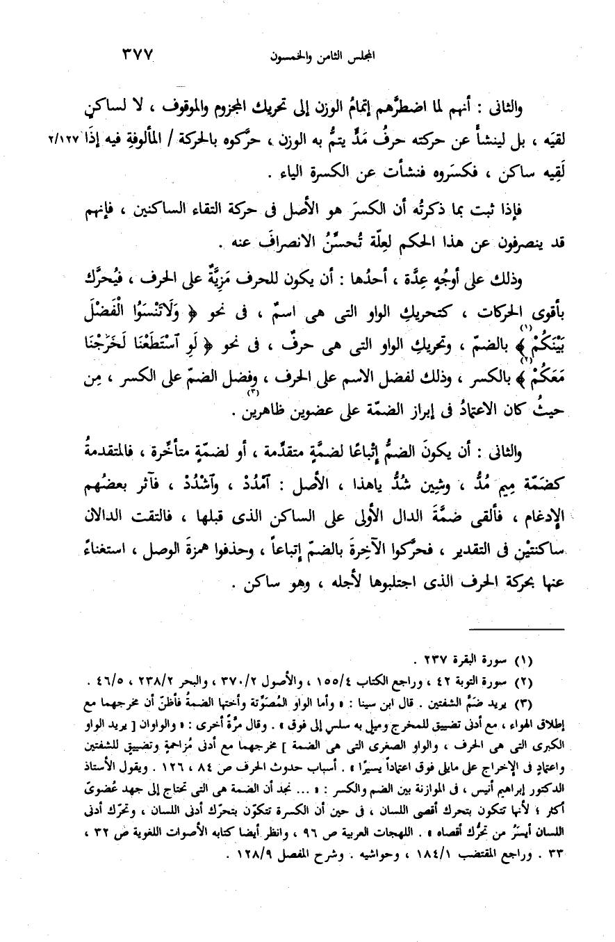 (¬3) يريد ضمّ الشفتين. قال ابن سينا: «وأما الواو المصوّتة وأختها الضمة فأظنّ أن مخرجهما مع إطلاق الهواء، مع أدنى تضييق للمخرج وميل به سلس إلى فوق». وقال مرّة أخرى: «والواوان [يريد الواو الكبرى التى هى الحرف، والواو الصغرى التى هى الضمة] مخرجهما مع أدنى مزاحمة وتضييق للشفتين واعتماد فى الإخراج على ما يلى فوق اعتمادا يسيرا». أسباب حدوث الحرف ص 84،126. ويقول الأستاذ الدكتور إبراهيم أنيس، فى الموازنة بين الضم والكسر: «. . . نجد أن الضمة هى التى تحتاج إلى جهد عضوىّ أكثر؛ لأنها تتكون بتحرك أقصى اللسان، فى حين أن الكسرة تتكوّن بتحرّك أدنى اللسان، وتحرّك أدنى اللسان أيسر من تحرّك أقصاه». اللهجات العربية ص 96، وانظر أيضا كتابه الأصوات اللغوية ص 32، 33. وراجع المقتضب 1/ 184، وحواشيه. وشرح المفصل 9/ 128.