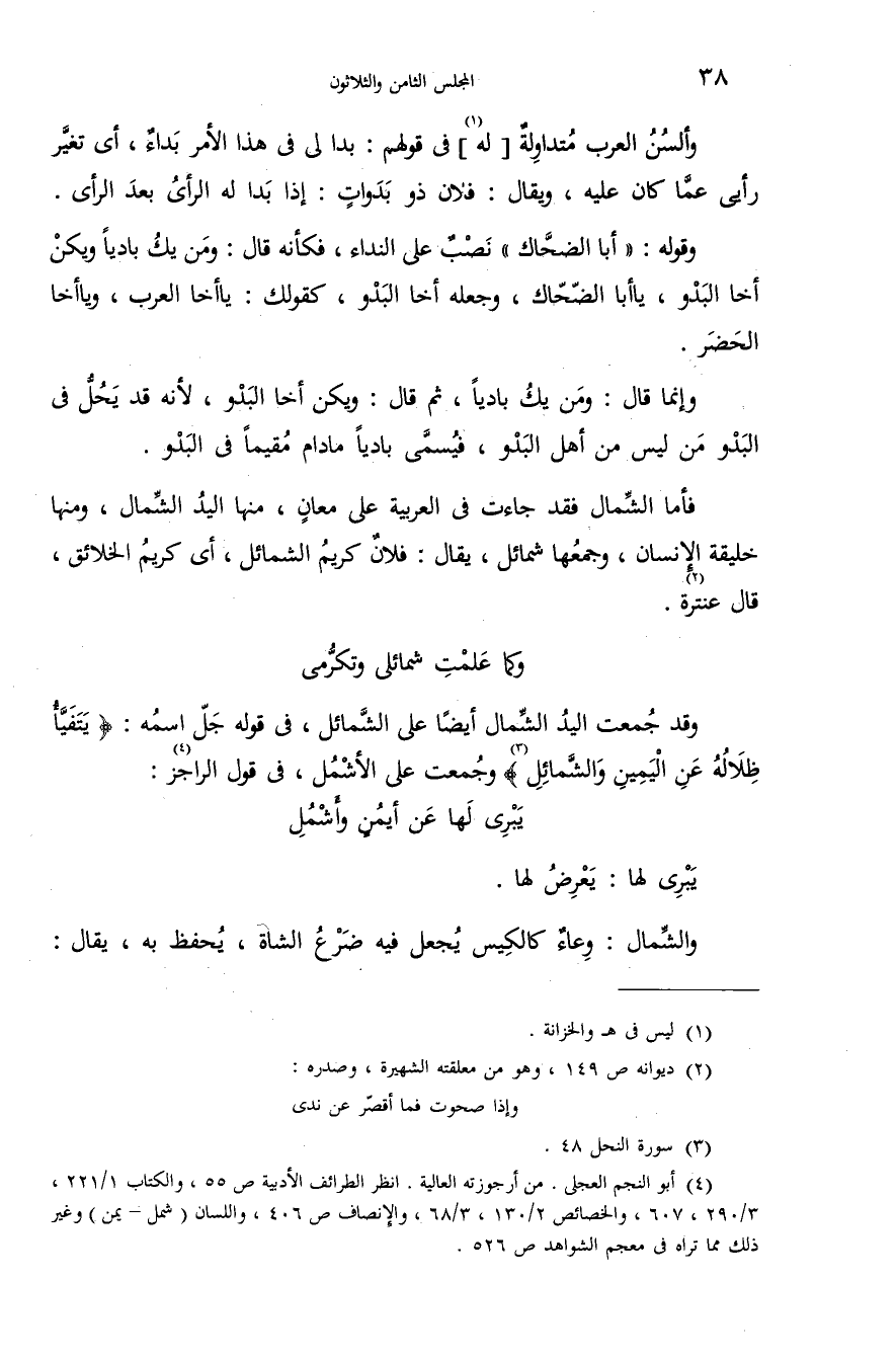 وقد جمعت اليد الشّمال أيضا على الشّمائل، فى قوله جلّ اسمه: {يَتَفَيَّؤُا ظِلالُهُ عَنِ الْيَمِينِ وَالشَّمائِلِ} (¬3) وجمعت على الأشمل، فى قول الراجز (¬4):
