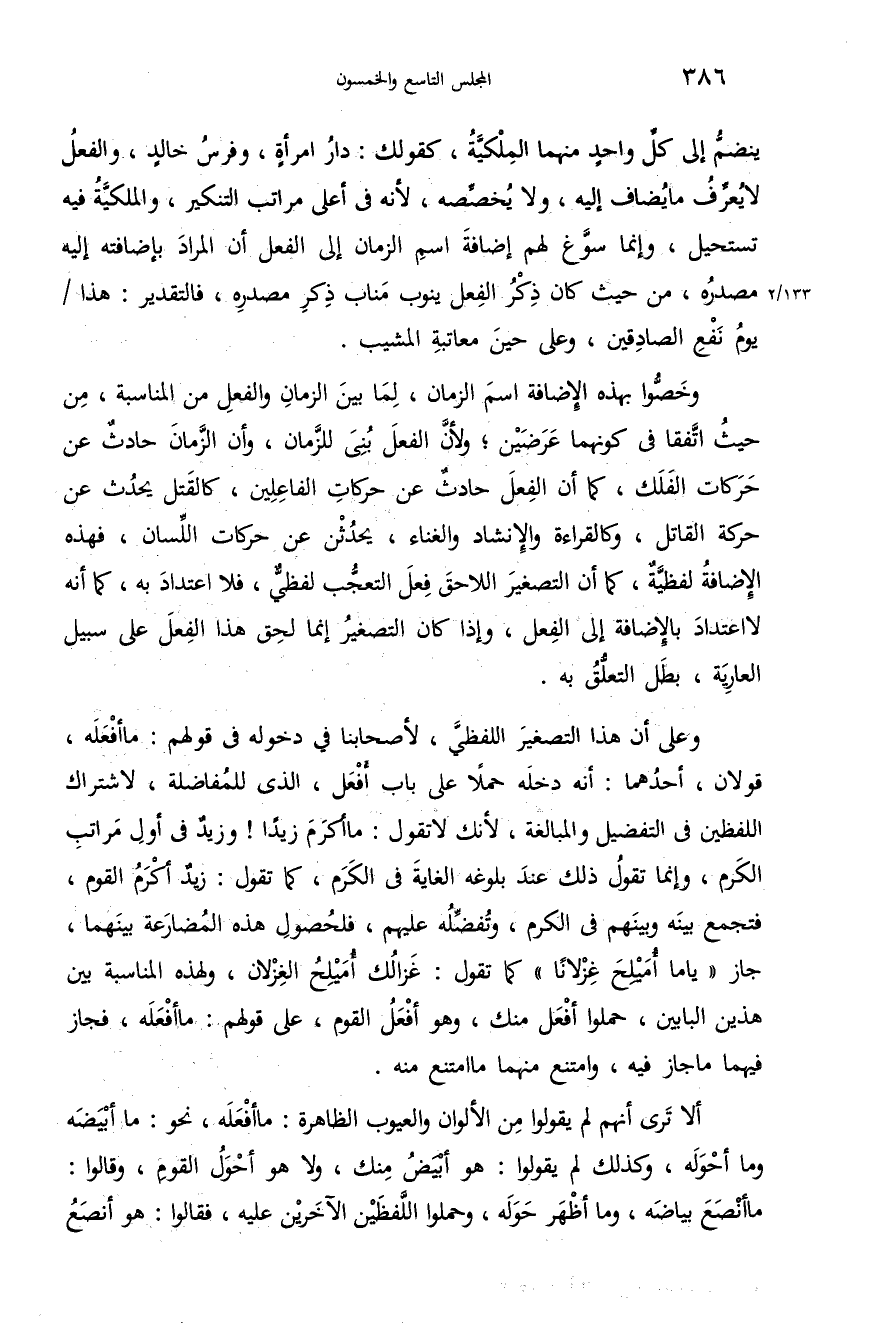 وخصّوا بهذه الإضافة اسم الزمان، لما بين الزمان والفعل من المناسبة، من حيث اتّفقا فى كونهما عرضين؛ ولأنّ الفعل بنى للزّمان، وأن الزّمان حادث عن حركات الفلك، كما أن الفعل حادث عن حركات الفاعلين، كالقتل يحدث عن حركة القاتل، وكالقراءة والإنشاد والغناء، يحدثن عن حركات اللّسان، فهذه الإضافة لفظيّة، كما أن التصغير اللاحق فعل التعجّب لفظيّ، فلا اعتداد به، كما أنه لا اعتداد بالإضافة إلى الفعل، وإذا كان التصغير إنما لحق هذا الفعل على سبيل العارية، بطل التعلّق به.