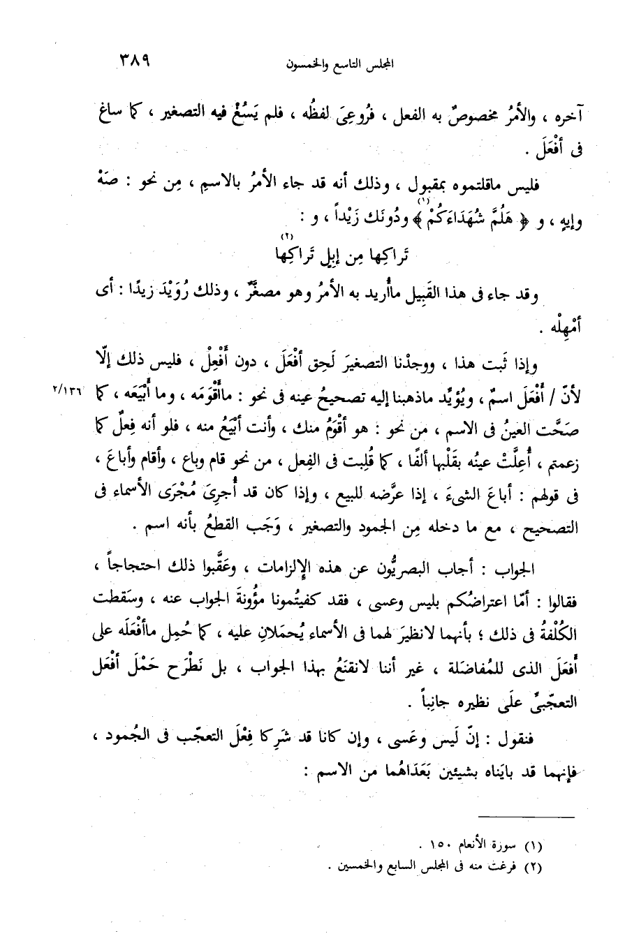 الجواب: أجاب البصريّون عن هذه الإلزامات، وعقّبوا ذلك احتجاجا، فقالوا: أمّا اعتراضكم بليس وعسى، فقد كفيتمونا مئونة الجواب عنه، وسقطت الكلفة فى ذلك؛ بأنهما لا نظير لهما فى الأسماء يحملان عليه، كما حمل ما أفعله على أفعل الذى للمفاضلة، غير أننا لا نقنع بهذا الجواب، بل نطرح حمل أفعل التعجّبيّ على نظيره جانبا.