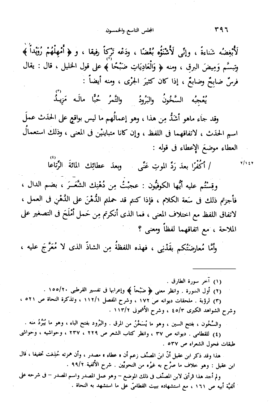 (¬4) للقطامى. ديوانه ص 37، وانظر كتاب الشعر ص 229،237، وحواشيه، وحواشى طبقات فحول الشعراء ص 537. هذا وقد ذكر ابن عقيل أنّ ابن المصنّف زعم أن «عطاء» مصدر، وأن همزته حذفت تخفيفا، قال ابن عقيل: وهو خلاف ما صرّح به غيره من النحويّين. شرح الألفية 2/ 99. ولم أجد هذا الرأى لابن المصنّف فى ذلك الموضع-وهو عمل المصدر واسم المصدر-فى شرحه على ألفيّة أبيه ص 161، مع استشهاده ببيت القطامىّ على ما استشهد به النحاة.