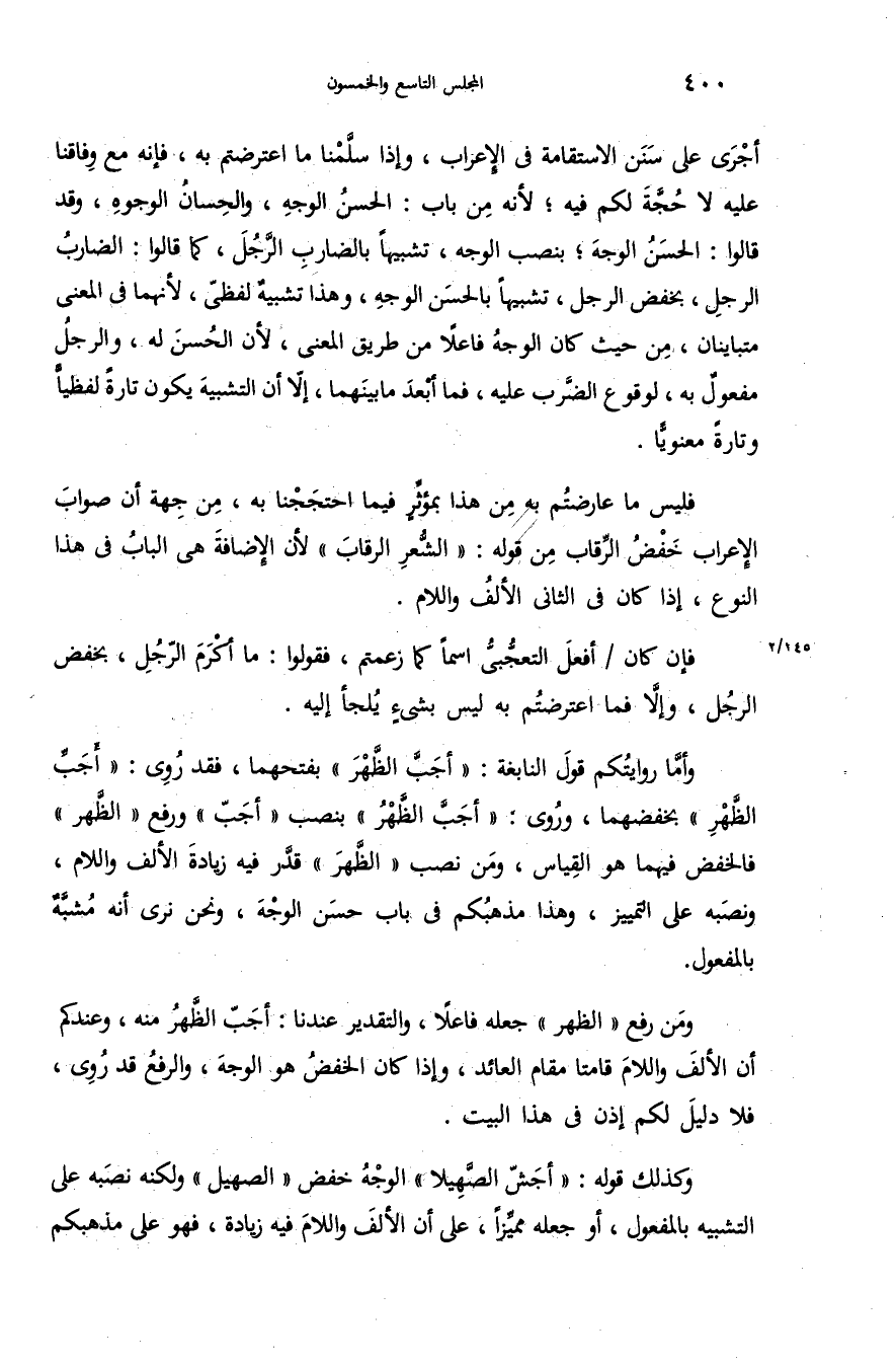 وأمّا روايتكم قول النابغة: «أجبّ الظّهر» بفتحهما، فقد روى: «أجبّ الظّهر» بخفضهما، وروى: «أجبّ الظّهر» بنصب «أجبّ» ورفع «الظّهر» فالخفض فيهما هو القياس، ومن نصب «الظّهر» قدّر فيه زيادة الألف واللام، ونصبه على التمييز، وهذا مذهبكم فى باب حسن الوجه، ونحن نرى أنه مشبّه بالمفعول.