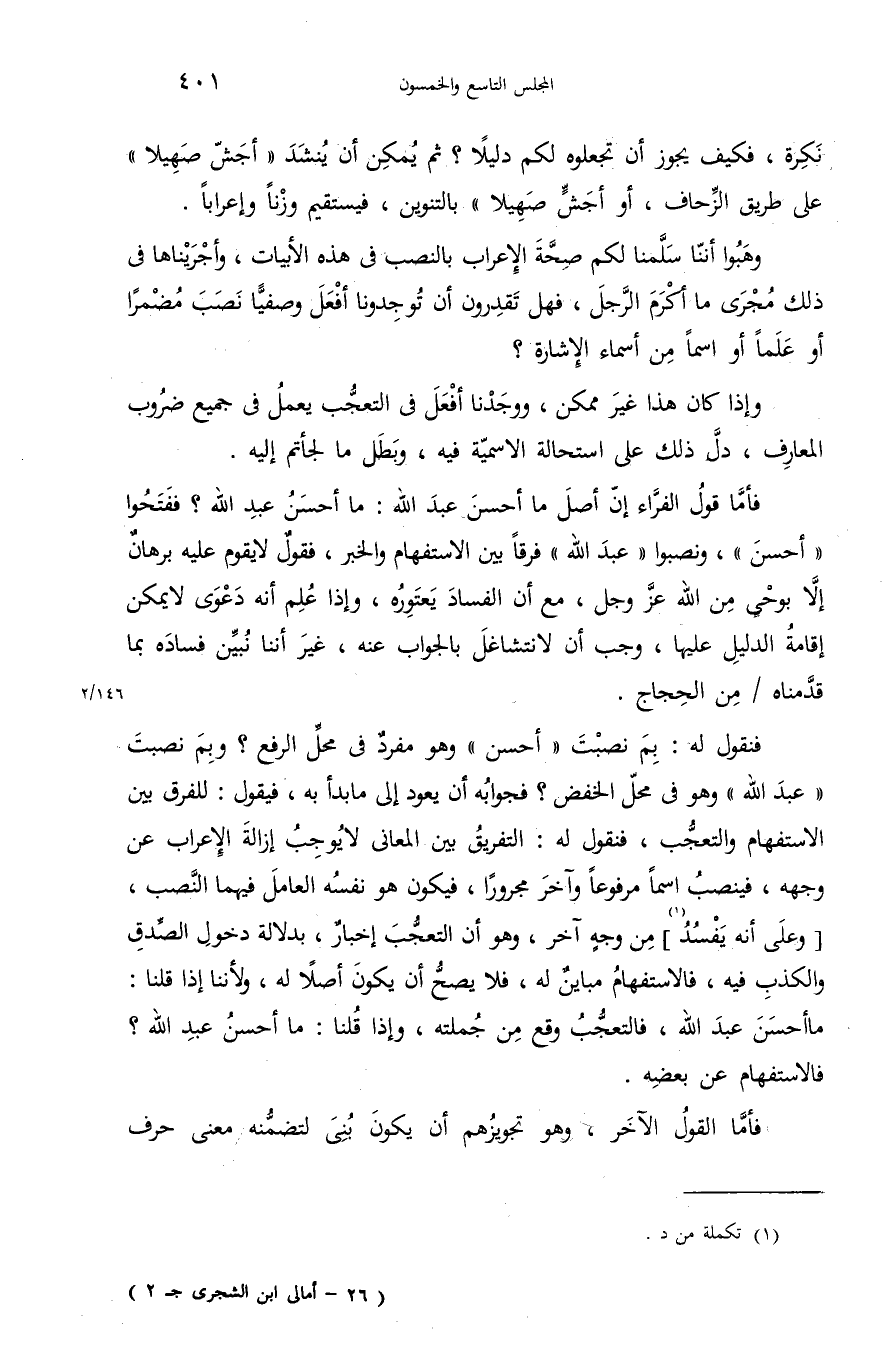 فأمّا قول الفرّاء إنّ أصل ما أحسن عبد الله: ما أحسن عبد الله؟ ففتحوا «أحسن»، ونصبوا «عبد الله» فرقا بين الاستفهام والخبر، فقول لا يقوم عليه برهان إلاّ بوحي من الله عزّ وجل، مع أن الفساد يعتوره، وإذا علم أنه دعوى لا يمكن إقامة الدليل عليها، وجب أن لا نتشاغل بالجواب عنه، غير أننا نبيّن فساده بما قدّمناه/من الحجاج.