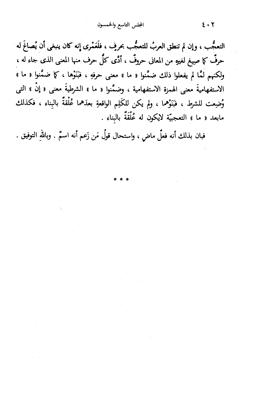 التعجّب، وإن لم تنطق العرب للتعجّب بحرف، فلعمرى إنه كان ينبغى أن يصاغ له حرف كما صيغ لغيره من المعانى حروف، أدّى كلّ حرف منها المعنى الذى جاء له، ولكنهم لمّا لم يفعلوا ذلك ضمّنوا «ما» معنى حرفه، فبنوها، كما ضمّنوا «ما» الاستفهامية معنى الهمزة الاستفهامية، وضمّنوا «ما» الشرطية معنى «إن» التى وضعت للشرط، فبنوهما، ولم يكن للكلم الواقعة بعدهما علقة بالبناء، فكذلك ما بعد «ما» التعجبيّة لا يكون له علقة بالبناء.