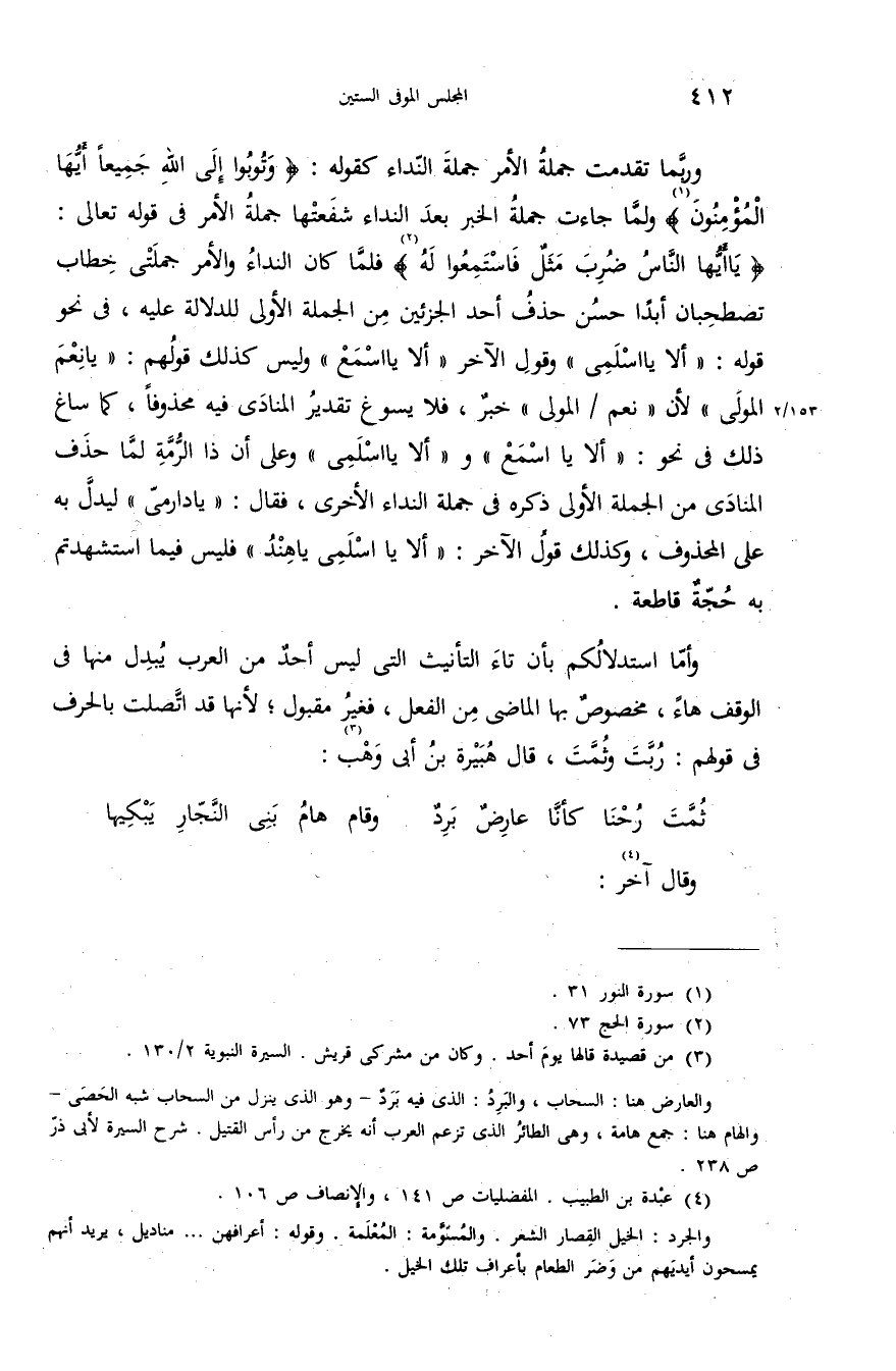 وربّما تقدمت جملة الأمر جملة النّداء كقوله: {وَتُوبُوا إِلَى اللهِ جَمِيعاً أَيُّهَا الْمُؤْمِنُونَ} (¬1) ولمّا جاءت جملة الخبر بعد النداء شفعتها جملة الأمر فى قوله تعالى: