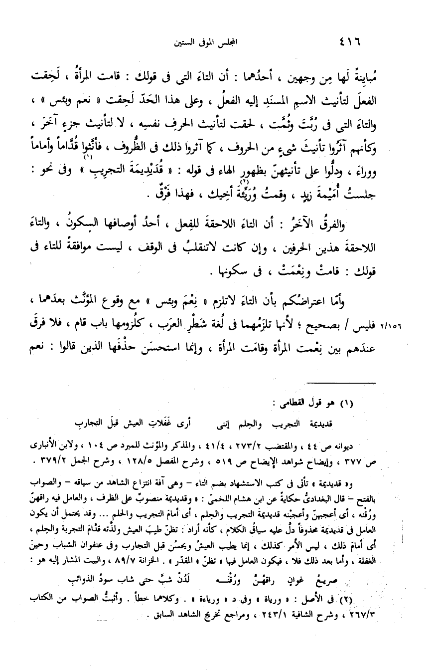 (¬1) هو قول القطامى: قديديمة التجريب والحلم إننى أرى غفلات العيش قبل التجارب ديوانه ص 44، والمقتضب 2/ 273،4/ 41، والمذكر والمؤنث للمبرد ص 104، ولابن الأنبارى ص 377، وإيضاح شواهد الإيضاح ص 519، وشرح المفصل 5/ 128، وشرح الجمل 2/ 379. و «قديديمة» تأتى فى كتب الاستشهاد بضم التاء-وهى آفة انتزاع الشاهد من سياقه-والصواب بالفتح-قال البغدادىّ حكاية عن ابن هشام اللخمىّ: «وقديديمة منصوب على الظرف، والعامل فيه راقهنّ ورقنه، أى أعجبهنّ وأعجبنه قديديمة التجريب والحلم، أى أمام التجريب والحلم. . . وقد يحتمل أن يكون العامل فى قديديمة محذوفا دلّ عليه سياق الكلام، كأنه أراد: تظنّ طيب العيش ولذّته قدّام التجربة والحلم، أى أمام ذلك، ليس الأمر كذلك، إنما يطيب العيش ويحسن قبل التجارب وفى عنفوان الشباب وحين الغفلة، وأما بعد ذلك فلا، فيكون العامل فيها «تظنّ» المقدّر». الخزانة 7/ 89، والبيت المشار إليه هو: صريع غوان راقهنّ ورقنه لدن شبّ حتى شاب سود الذوائب