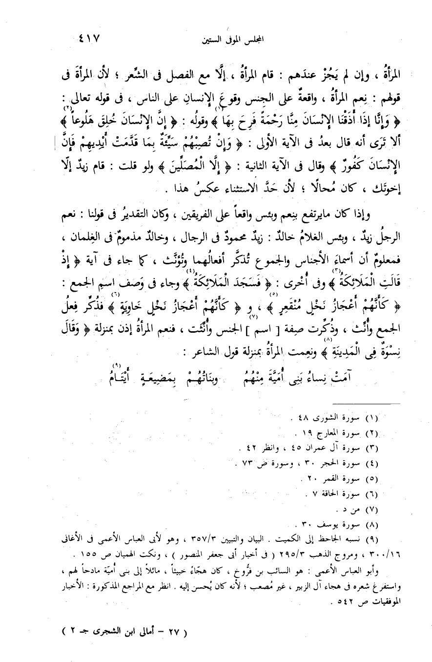 {وَإِنّا إِذا أَذَقْنَا الْإِنْسانَ مِنّا رَحْمَةً فَرِحَ بِها} (¬1) وقوله: {إِنَّ الْإِنْسانَ خُلِقَ هَلُوعاً} (¬2) ألا ترى أنه قال بعد فى الآية الأولى: {وَإِنْ تُصِبْهُمْ سَيِّئَةٌ بِما قَدَّمَتْ أَيْدِيهِمْ فَإِنَّ الْإِنْسانَ كَفُورٌ} وقال فى الآية الثانية: {إِلاَّ الْمُصَلِّينَ} ولو قلت: قام زيد إلاّ إخوتك، كان محالا؛ لأن حدّ الاستثناء عكس هذا.