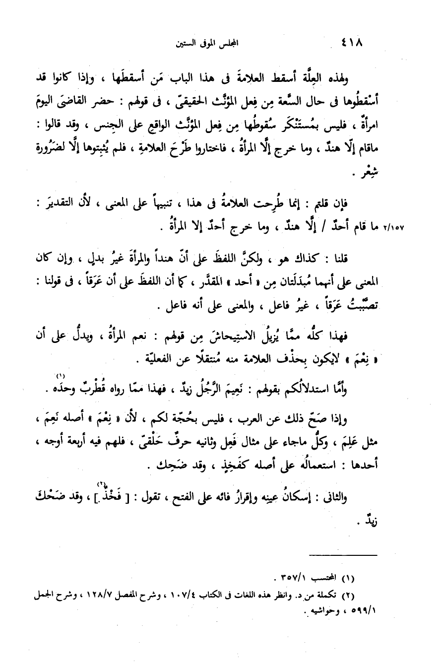 وإذا صحّ ذلك عن العرب، فليس بحجّة لكم، لأن «نعم» أصله نعم، مثل علم، وكلّ ما جاء على مثال فعل وثانيه حرف حلقىّ، فلهم فيه أربعة أوجه، أحدها: استعماله على أصله كفخذ، وقد ضحك.