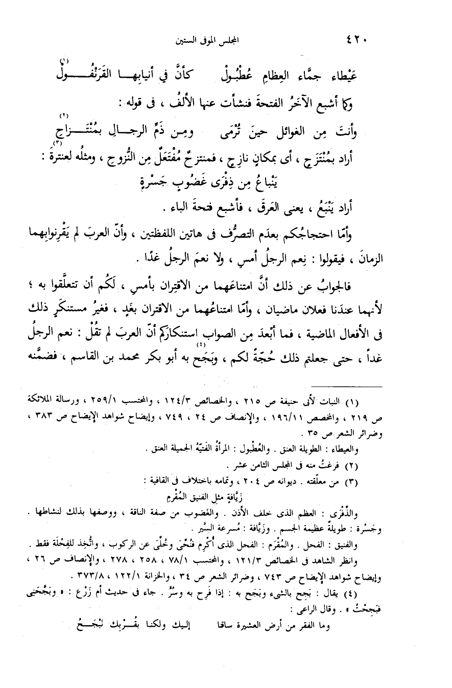 فالجواب عن ذلك أنّ امتناعهما من الاقتران بأمس، لكم أن تتعلّقوا به؛ لأنهما عندنا فعلان ماضيان، وأمّا امتناعهما من الاقتران بغد، فغير مستنكر ذلك فى الأفعال الماضية، فما أبعد من الصواب استنكاركم أنّ العرب لم تقل: نعم الرجل غدا، حتى جعلتم ذلك حجّة لكم، وبجح (¬4) به أبو بكر محمد بن القاسم، فضمّنه