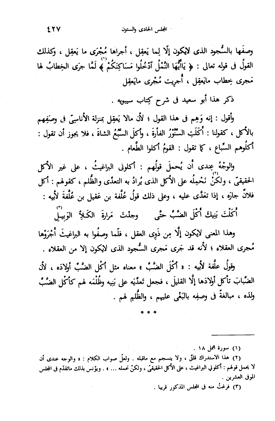 (¬2) هذا الاستدراك قلق، ولا ينسجم مع ما قبله. ولعلّ صواب الكلام: «والوجه عندى أن لا يحمل قولهم: أكلوني البراغيث، على الأكل الحقيقىّ، ولكن نحمله. . .». ويؤنس بذلك ما تقدّم فى المجلس الموفى العشرين.