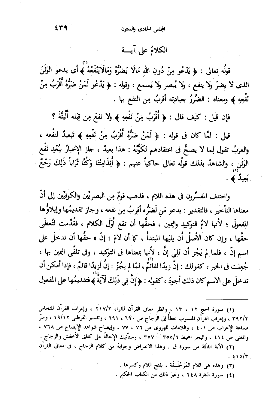 (¬1) سورة الحج 12،13، وانظر معانى القرآن للفراء 2/ 217، وإعراب القرآن للنحاس 2/ 392، وإعراب القرآن المنسوب خطأ إلى الزجاج ص 690،691، وتفسير القرطبى 12/ 19، وسرّ صناعة الإعراب ص 401، واللامات للهروى ص 76،77، وإيضاح شواهد الإيضاح ص 768، والمغنى ص 414، والبحر المحيط 6/ 355 - 357، وستأتيك الإحالة على كتابى الأخفش والزجاج.