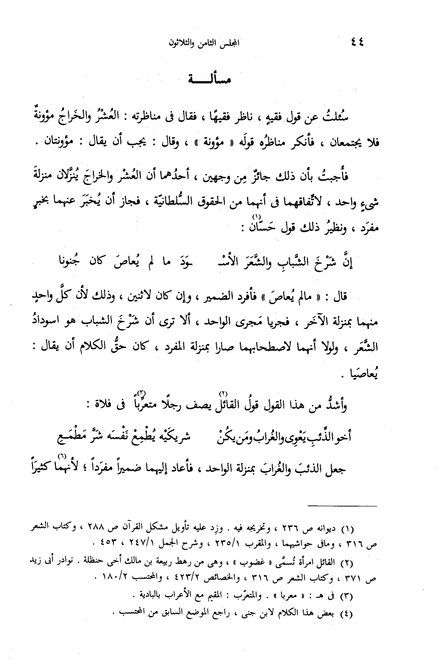 سئلت عن قول فقيه، ناظر فقيها، فقال فى مناظرته: العشر والخراج مئونة فلا يجتمعان، فأنكر مناظره قوله «مئونة»، وقال: يجب أن يقال: مئونتان.