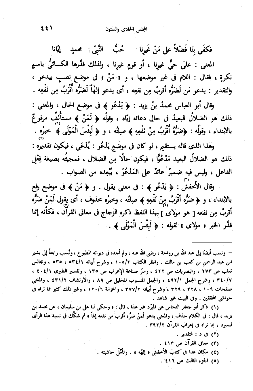 (¬1) ذكر أبو جعفر النحاس عن المبرّد غير هذا، قال: «وحكى لنا على بن سليمان، عن محمد بن يزيد، قال: فى الكلام حذف، والمعنى يدعو لمن ضرّه أقرب من نفعه إلها» ثم شكّك فى نسبة هذا الرأى للمبرد، بما تراه فى إعراب القرآن 2/ 392.