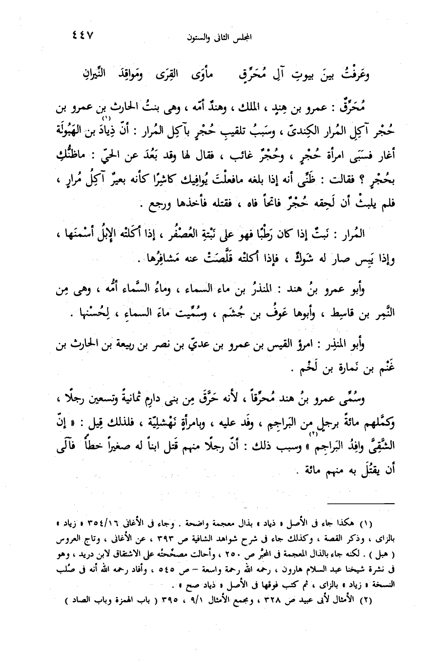 محرّق: عمرو بن هند، الملك، وهند أمّه، وهى بنت الحارث بن عمرو بن حجر آكل المرار الكندىّ، وسبب تلقيب حجر بآكل المرار: أنّ ذياد (¬1) بن الهبولة أغار فسبى امرأة حجر، وحجر غائب، فقال لها وقد بعد عن الحيّ: ما ظنّك بحجر؟ فقالت: ظنّى أنه إذا بلغه ما فعلت يوافيك كاشرا كأنه بعير آكل مرار، فلم يلبث أن لحقه حجر فاتحا فاه، فقتله فأخذها ورجع.