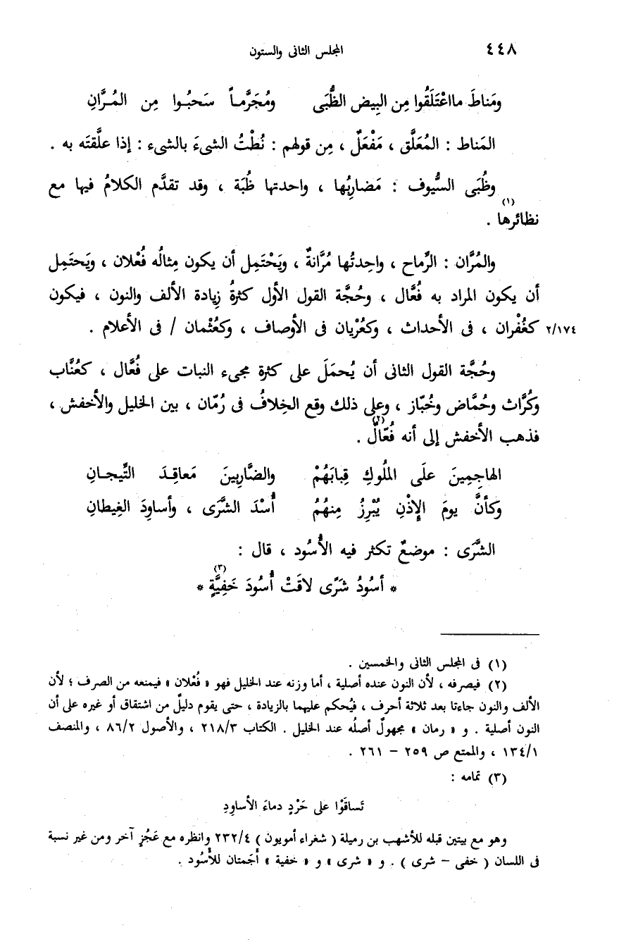 والمرّان: الرّماح، واحدتها مرّانة، ويحتمل أن يكون مثاله فعلان، ويحتمل أن يكون المراد به فعّال، وحجّة القول الأول كثرة زيادة الألف والنون، فيكون كغفران، فى الأحداث، وكعريان فى الأوصاف، وكعثمان/فى الأعلام.