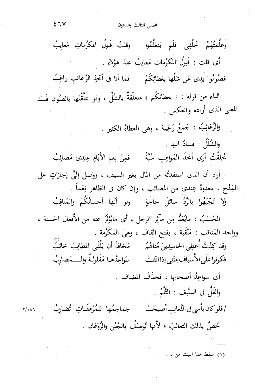 وقد كدت أعطى الحاسدين مناهم … مخافة أن يلقى المطالب خائب (¬1)