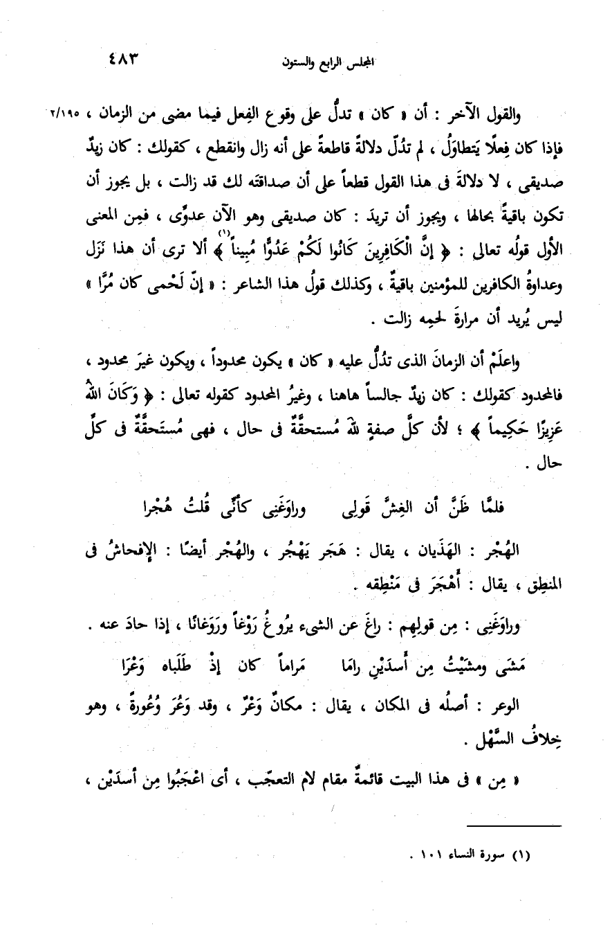 والقول الآخر: أن «كان» تدلّ على وقوع الفعل فيما مضى من الزمان، فإذا كان فعلا يتطاول، لم تدلّ دلالة قاطعة على أنه زال وانقطع، كقولك: كان زيد صديقى، لا دلالة فى هذا القول قطعا على أن صداقته لك قد زالت، بل يجوز أن تكون باقية بحالها، ويجوز أن تريد: كان صديقى وهو الآن عدوّى، فمن المعنى الأول قوله تعالى: {إِنَّ الْكافِرِينَ كانُوا لَكُمْ عَدُوًّا مُبِيناً} (¬1) ألا ترى أن هذا نزل وعداوة الكافرين للمؤمنين باقية، وكذلك قول هذا الشاعر: «إنّ لحمى كان مرّا» ليس يريد أن مرارة لحمه زالت.