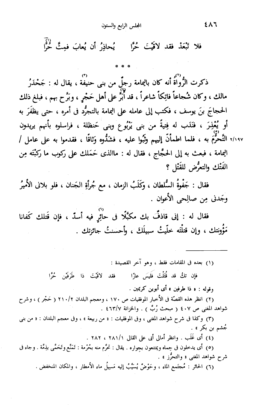 (¬1) بعده فى المقامات فقط، وهو آخر القصيدة: فإن تك قد قتلت فليس عارا فقد لاقيت ذا طرفين حرّا وقوله: «ذا طرفين» أى أبوين كريمين.