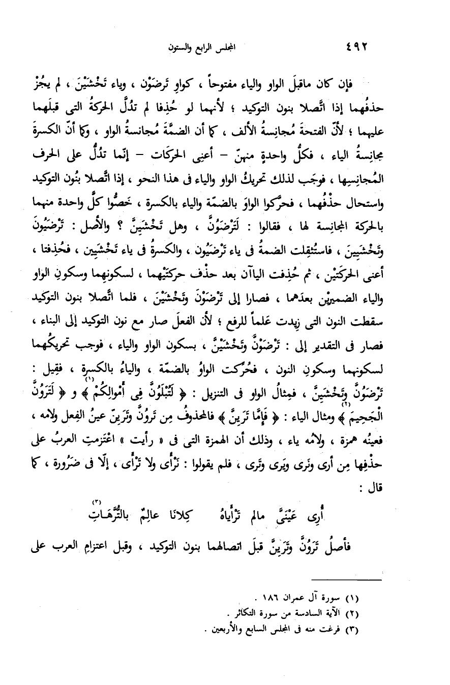 ترضونّ وتخشينّ، فمثال الواو فى التنزيل: {لَتُبْلَوُنَّ فِي أَمْوالِكُمْ} (¬1) و {لَتَرَوُنَّ الْجَحِيمَ} (¬2) ومثال الياء: {فَإِمّا تَرَيِنَّ} فالمحذوف من ترونّ وترينّ عين الفعل ولامه، فعينه همزة، ولامه ياء، وذلك أن الهمزة التى فى «رأيت» اعتزمت العرب على حذفها من أرى ونرى ويرى وترى، فلم يقولوا: نرأى ولا ترأى، إلاّ فى ضرورة، كما قال: