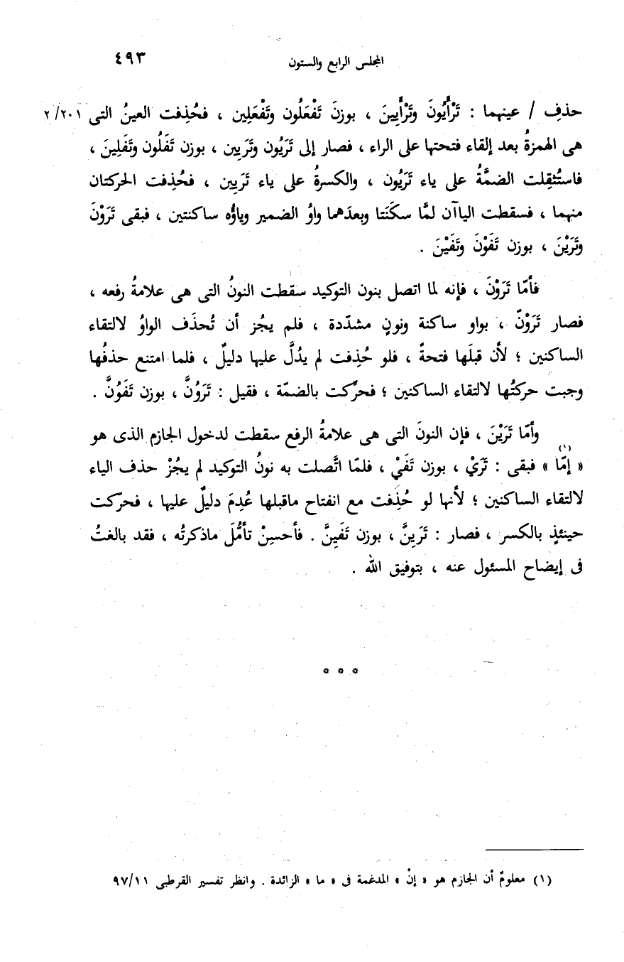 وأمّا ترين، فإن النون التى هى علامة الرفع سقطت لدخول الجازم الذى هو «إمّا» (¬1) فبقى: تري، بوزن تفي، فلمّا اتّصلت به نون التوكيد لم يجز حذف الياء لالتقاء الساكنين؛ لأنها لو حذفت مع انفتاح ما قبلها عدم دليل عليها، فحرّكت حينئذ بالكسر، فصار: ترينّ، بوزن تفينّ. فأحسن تأمّل ما ذكرته، فقد بالغت فى إيضاح المسئول عنه، بتوفيق الله.