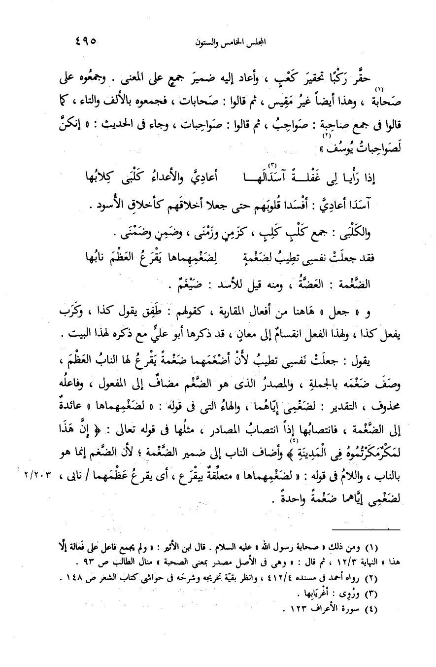 حقّر ركبا تحقير كعب، وأعاد إليه ضمير جمع على المعنى. وجمعوه على صحابة (¬1)، وهذا أيضا غير مقيس، ثم قالوا: صحابات، فجمعوه بالألف والتاء، كما قالوا فى جمع صاحبة: صواحب، ثم قالوا: صواحبات، وجاء فى الحديث: «إنكنّ لصواحبات يوسف (¬2)»