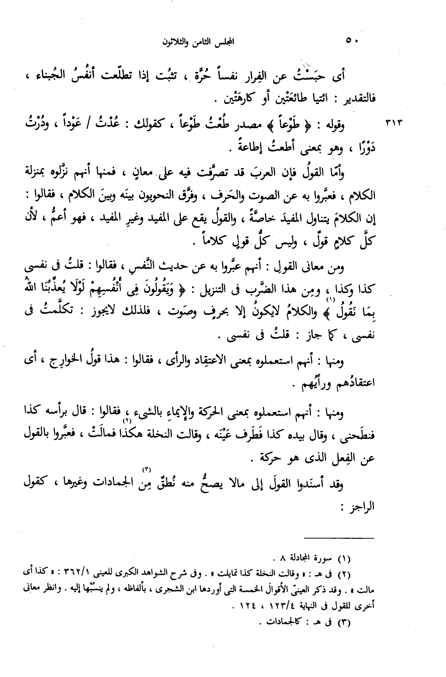 ومن معانى القول: أنهم عبّروا به عن حديث النّفس، فقالوا: قلت فى نفسى كذا وكذا، ومن هذا الضّرب فى التنزيل: {وَيَقُولُونَ فِي أَنْفُسِهِمْ لَوْلا يُعَذِّبُنَا اللهُ بِما نَقُولُ} (¬1) والكلام لا يكون إلا بحرف وصوت، فلذلك لا يجوز: تكلّمت فى نفسى، كما جاز: قلت فى نفسى.