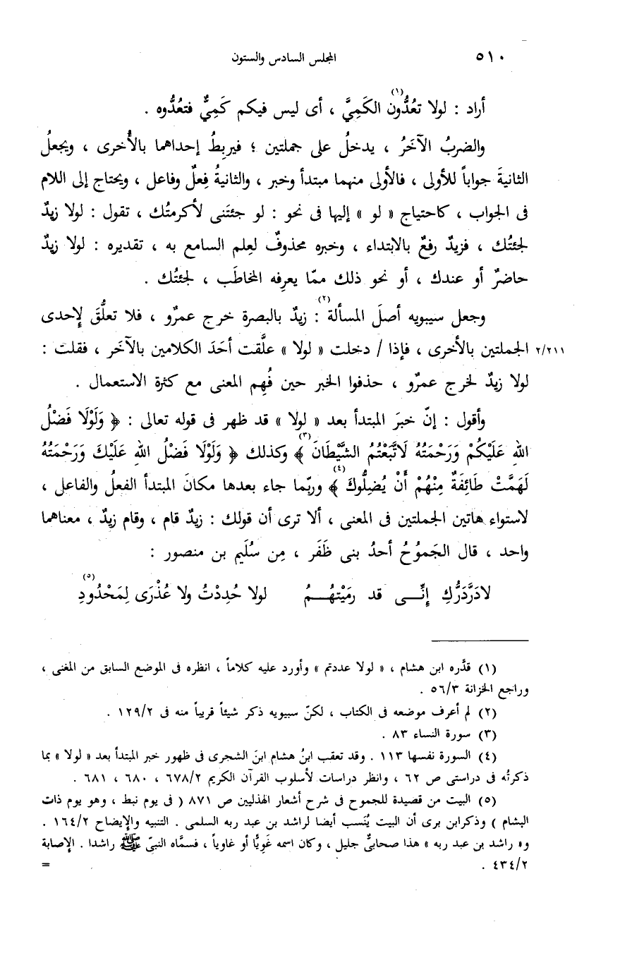 (¬4) السورة نفسها 113. وقد تعقب ابن هشام ابن الشجرى فى ظهور خبر المبتدأ بعد «لولا» بما ذكرته فى دراستى ص 62، وانظر دراسات لأسلوب القرآن الكريم 2/ 678،680،681.