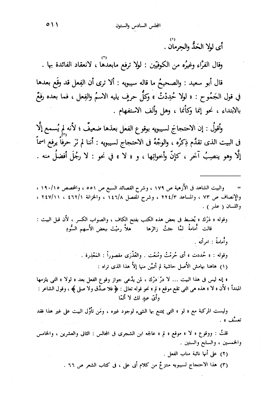(¬1) هاهنا بهامش الأصل حاشية لم أتبيّن منها إلاّ هذا الذى تراه: «إنه ليس فى هذا البيت. . . لا درّ درّك، لمن يدّعى جواز وقوع الفعل بعد «لولا» التى يلزمها المبتدأ؛ لأن «لا» هذه هى التى تقع موقع «لم» نحو قوله تعالى: فَلا صَدَّقَ وَلا صَلّى، وقول الشاعر: وأىّ عبد لك لا ألمّا وليست المركبة مع «لو» التى يمتنع بها الشىء لوجود غيره، ومن تأوّل البيت على غير هذا فقد تعسّف». قلت: ووقوع «لا» موقع «لم» عالجه ابن الشجرى فى المجالس: الثانى والعشرين، والخامس والخمسين، والسابع والستين.