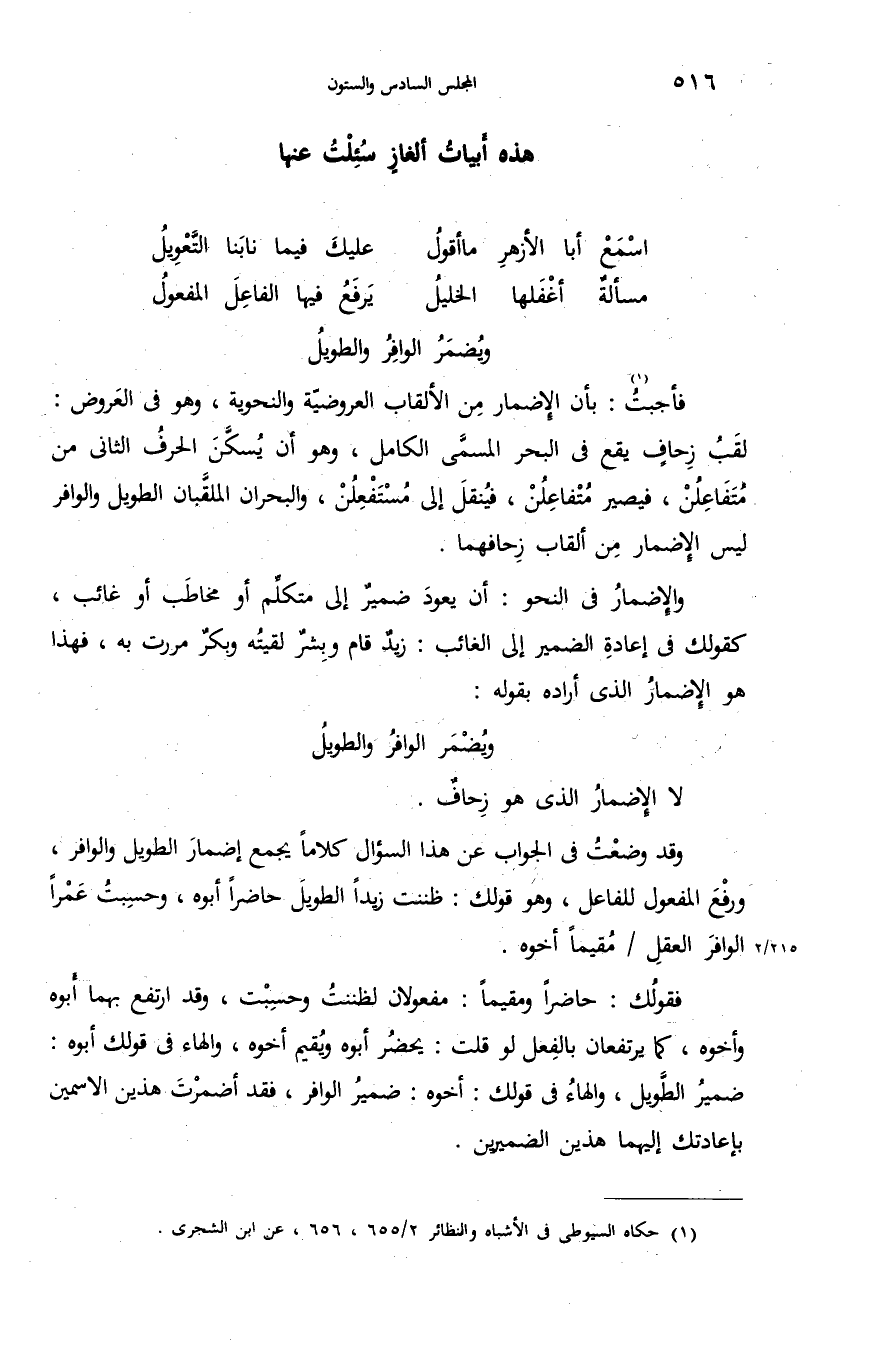 فأجبت (¬1): بأن الإضمار من الألقاب العروضيّة والنحوية، وهو فى العروض: