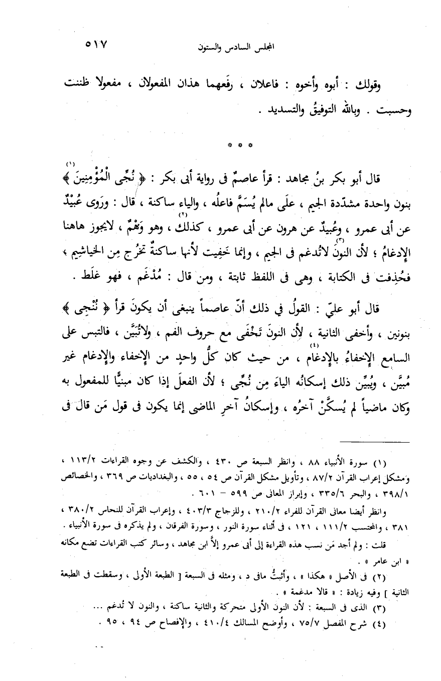 ... قال أبو بكر بن مجاهد: قرأ عاصم فى رواية أبى بكر: «نجى المؤمنين» (¬1) بنون واحدة مشدّدة الجيم، على ما لم يسمّ فاعله، والياء ساكنة، قال: وروى عبيد عن أبى عمرو، وعبيد عن هارون عن أبى عمرو، كذلك (¬2)، وهو وهم، لا يجوز هاهنا الإدغام؛ لأن النون (¬3) لا تدغم فى الجيم، وإنما خفيت لأنها ساكنة تخرج من الخياشيم، فحذفت فى الكتابة، وهى فى اللفظ ثابتة، ومن قال: مدغم، فهو غلط.