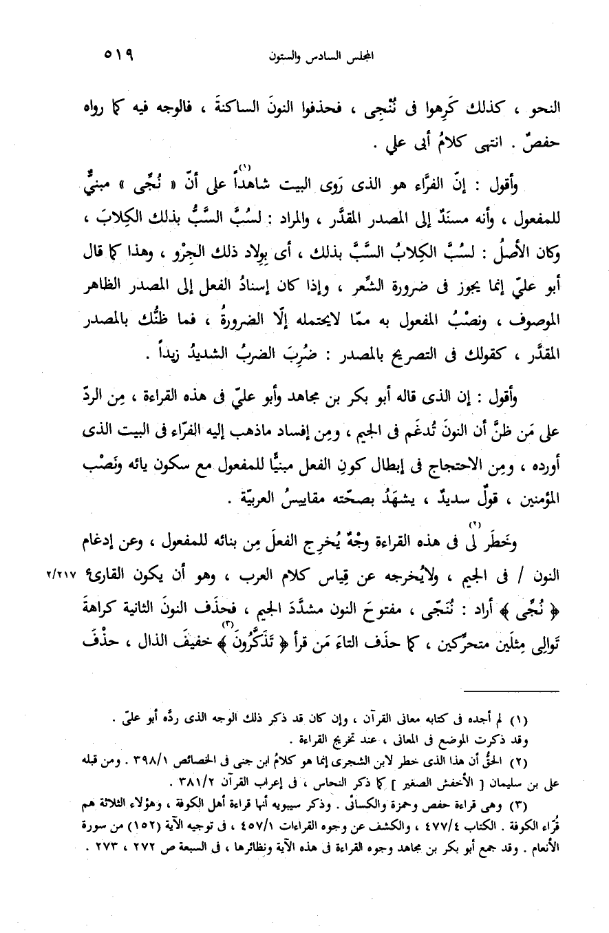 وأقول: إن الذى قاله أبو بكر بن مجاهد وأبو عليّ فى هذه القراءة، من الردّ على من ظنّ أن النون تدغم فى الجيم، ومن إفساد ما ذهب إليه الفرّاء فى البيت الذى أورده، ومن الاحتجاج فى إبطال كون الفعل مبنيّا للمفعول مع سكون يائه ونصب المؤمنين، قول سديد، يشهد بصحّته مقاييس العربيّة.