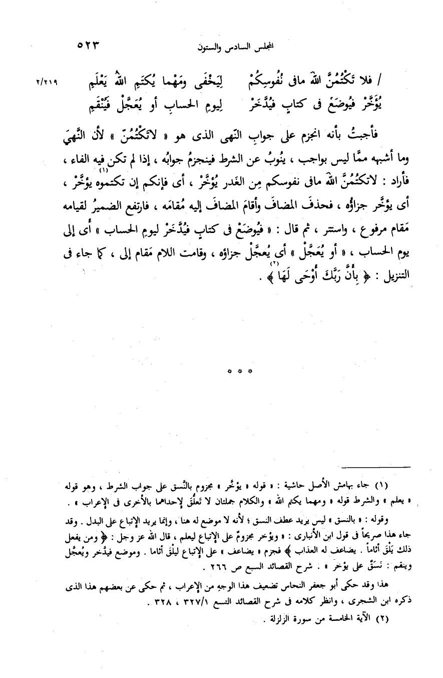 (¬1) جاء بهامش الأصل حاشية: «قوله «يؤخّر» مجزوم بالنّسق على جواب الشرط، وهو قوله «يعلم» والشرط قوله «ومهما يكتم الله» والكلام جملتان لا تعلّق لإحداهما بالأخرى فى الإعراب». وقوله: «بالنسق» ليس يريد عطف النسق؛ لأنه لا موضع له هنا، وإنما يريد الإتباع على البدل. وقد جاء هذا صريحا فى قول ابن الأنبارى: «ويؤخر مجزوم على الإتباع ليعلم، قال الله عز وجل: وَمَنْ يَفْعَلْ ذلِكَ يَلْقَ أَثاماً. يُضاعَفْ لَهُ الْعَذابُ فجزم «يضاعف» على الإتباع ليلق أثاما. وموضع فيدّخر ويعجّل وينقم: نسق على يؤخر». شرح القصائد السبع ص 266. هذا وقد حكى أبو جعفر النحاس تضعيف هذا الوجه من الإعراب، ثم حكى عن بعضهم هذا الذى ذكره ابن الشجرى، وانظر كلامه فى شرح القصائد التسع 1/ 327،328.