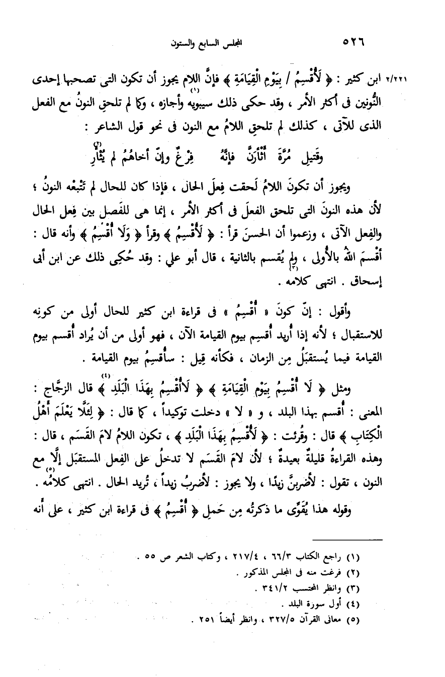 ابن كثير: «لأقسم/بيوم القيامة» فإنّ اللام يجوز أن تكون التى تصحبها إحدى النّونين فى أكثر الأمر، وقد حكى ذلك سيبويه (¬1) وأجازه، وكما لم تلحق النون مع الفعل الذى للآتى، كذلك لم تلحق اللام مع النون فى نحو قول الشاعر: